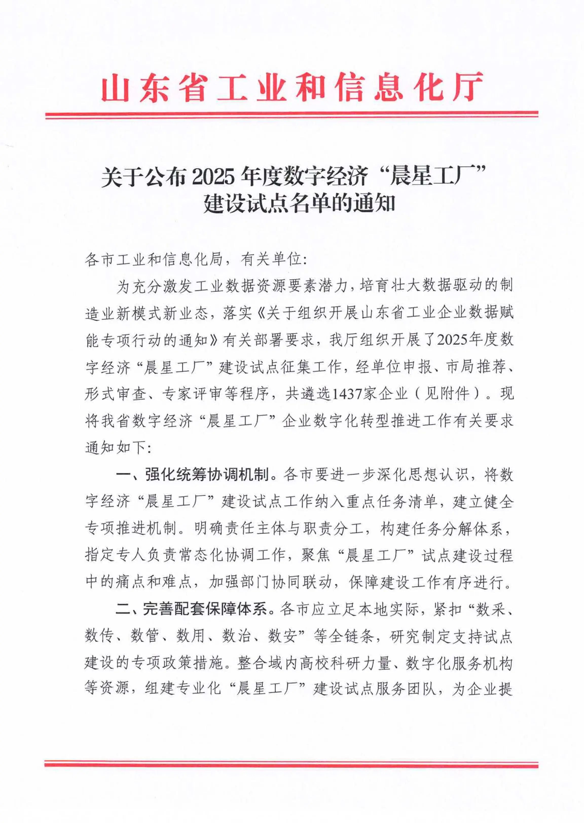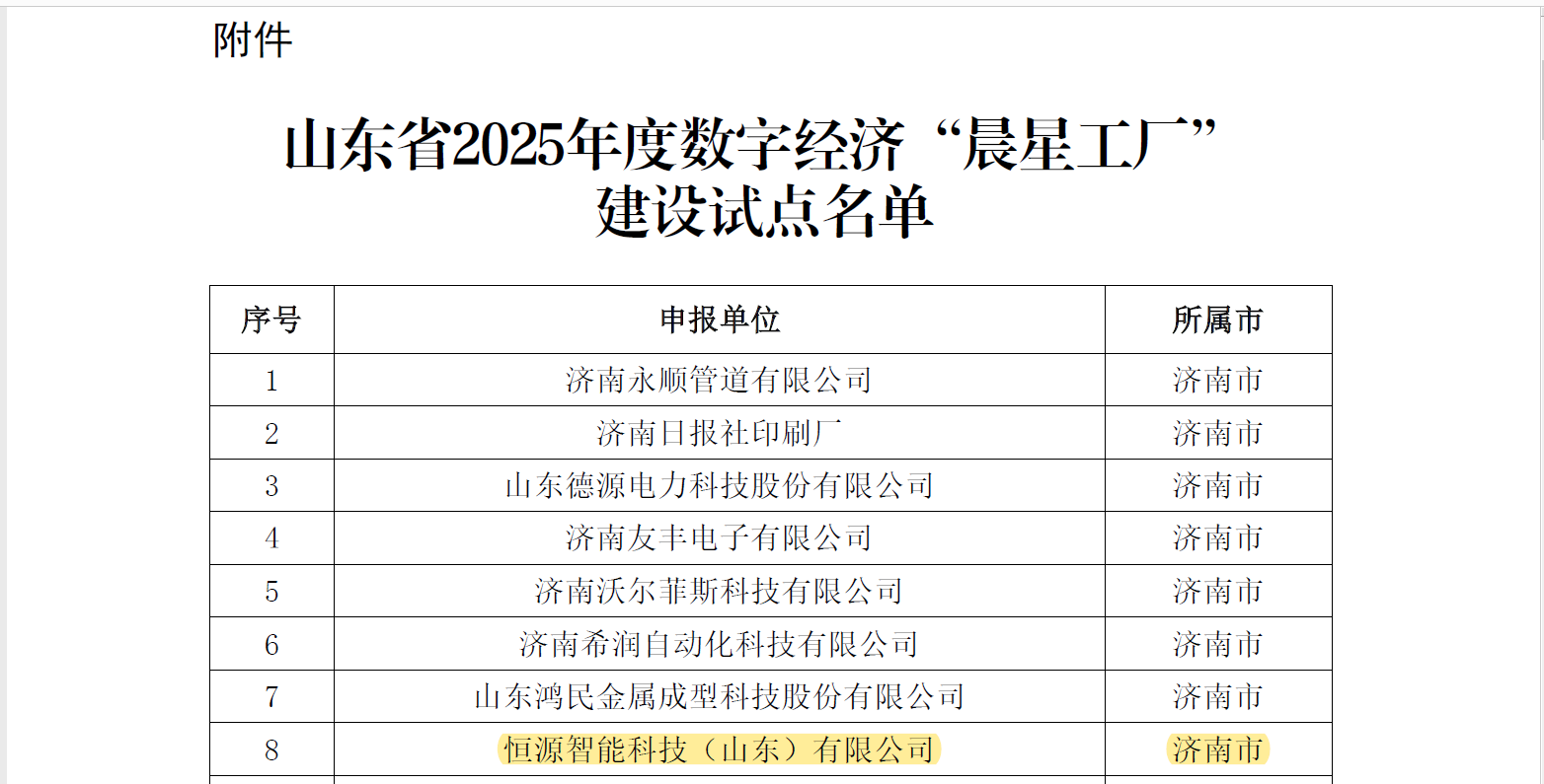 近日,山東省工業(yè)和信息化廳下發(fā)《關(guān)于公布2025年度數(shù)字經(jīng)濟(jì)“晨星工廠”建設(shè)試點(diǎn)名單的通知》,山東大恒能源科技集團(tuán)旗下恒源智能科技(山東)有限公司、濟(jì)南山源環(huán)保科技有限公司兩家公司成功入選!